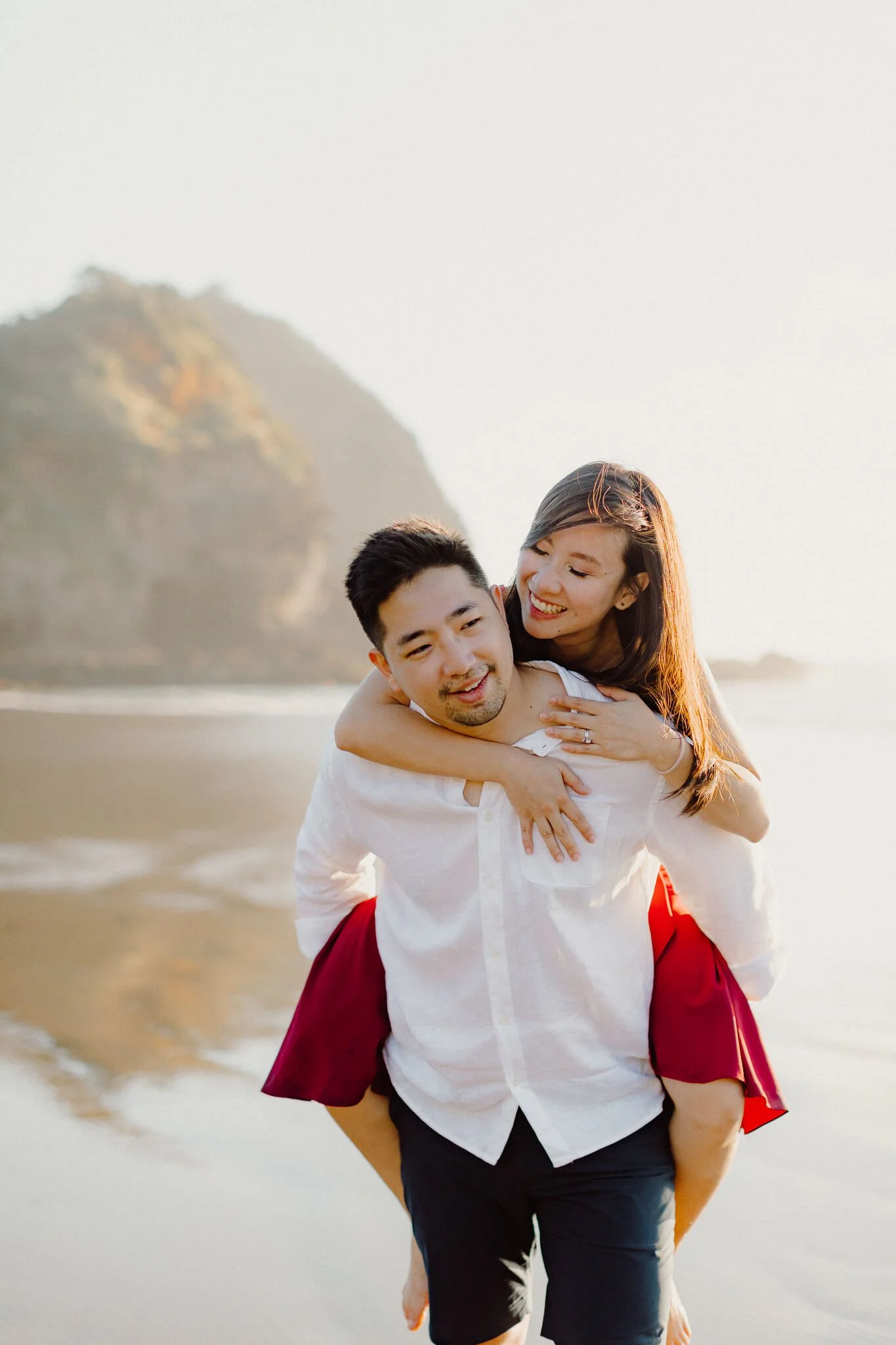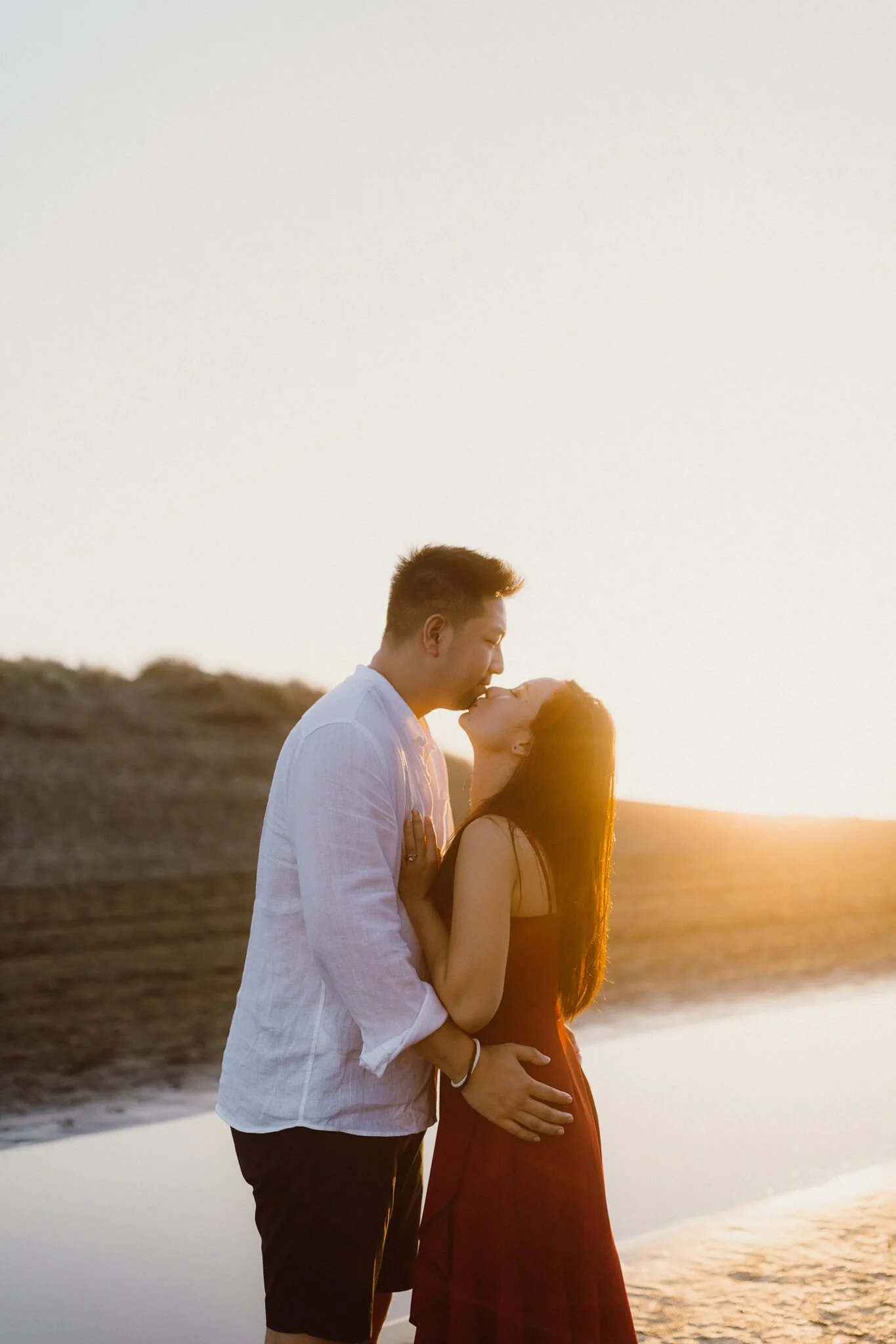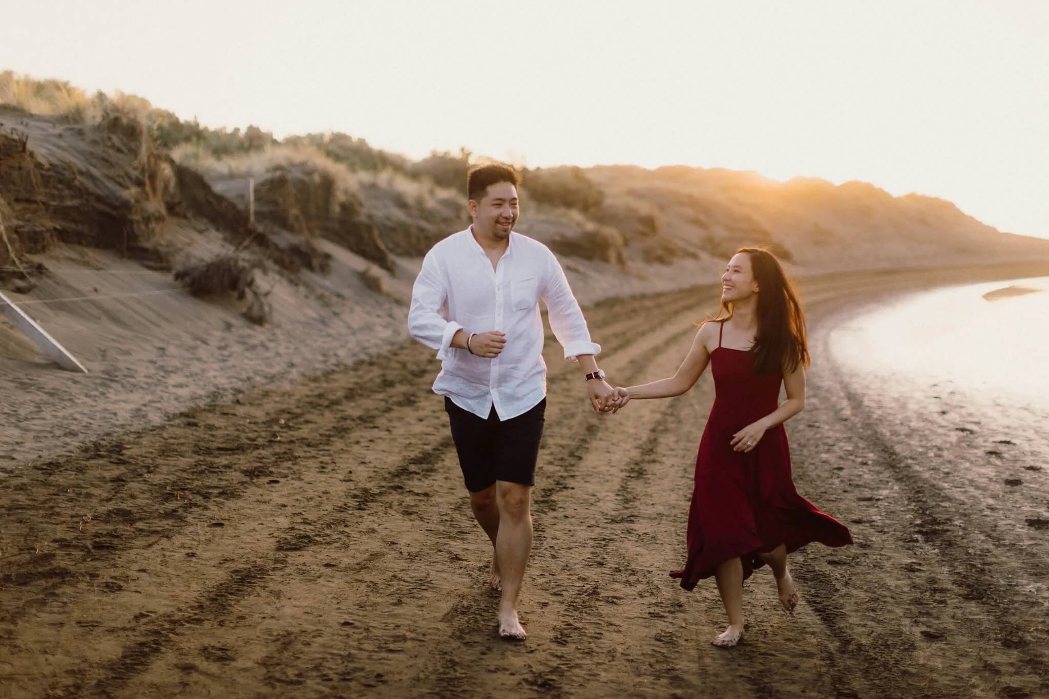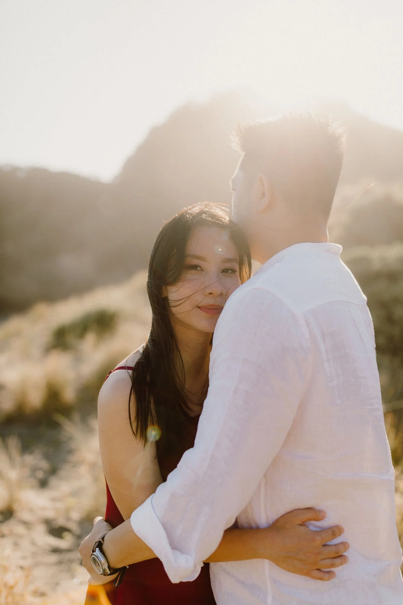 Golden hour photography portraits for Grace and Cedric's post wedding photography session at Te Henga beach, Auckland.