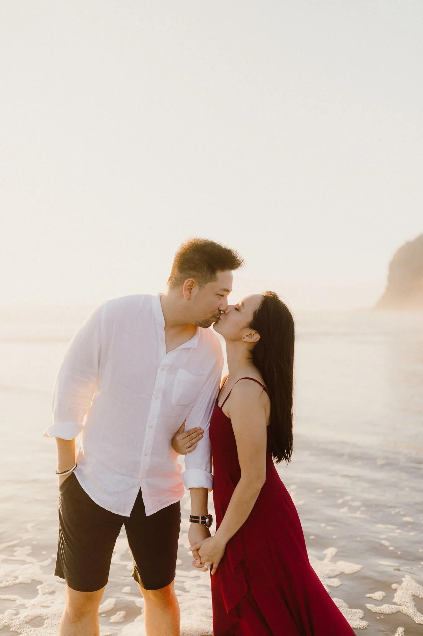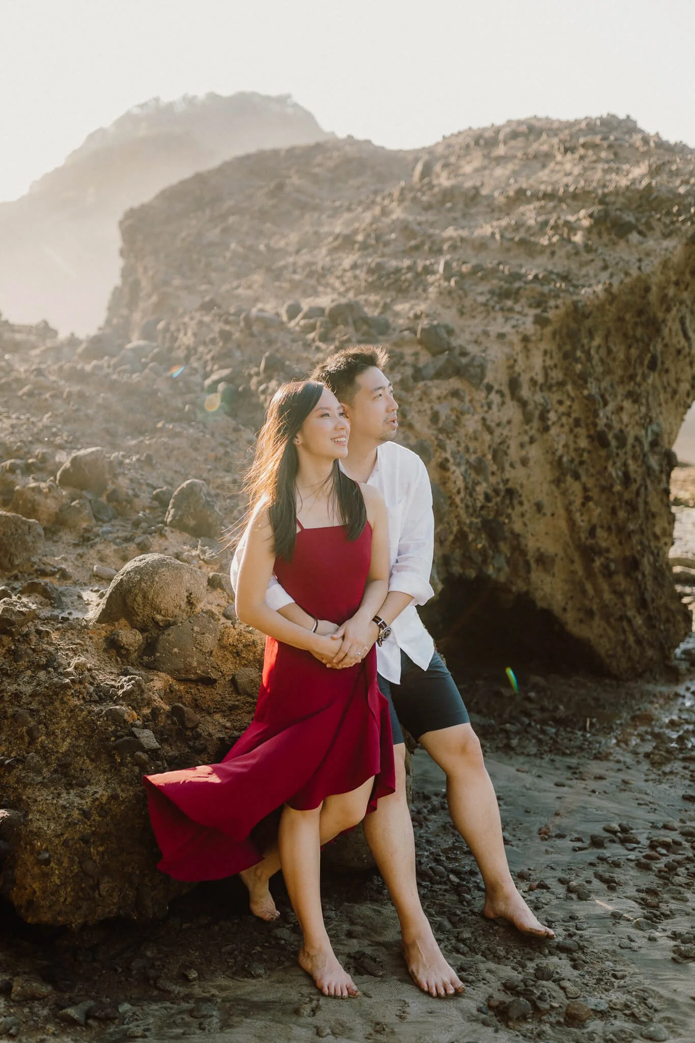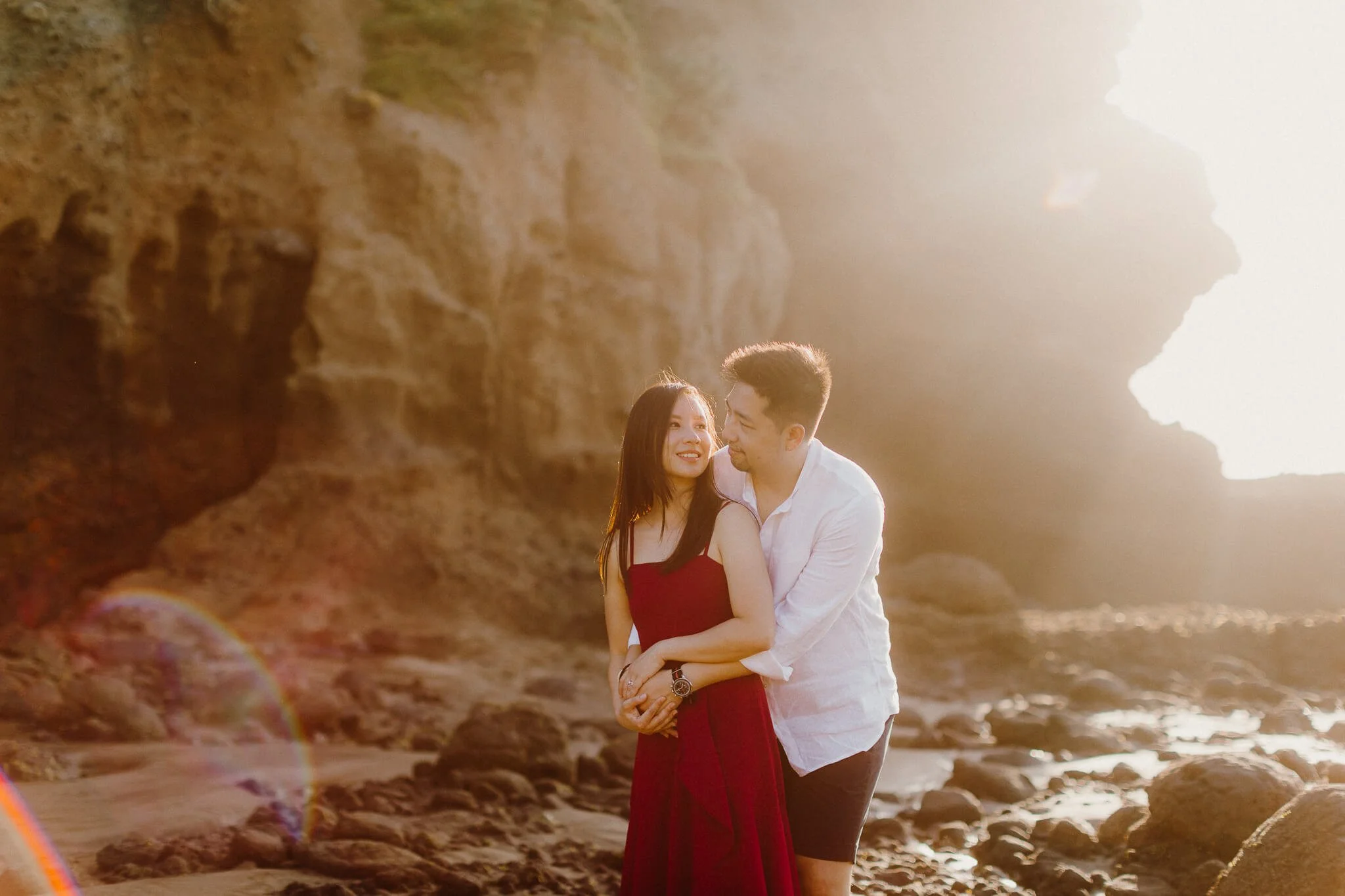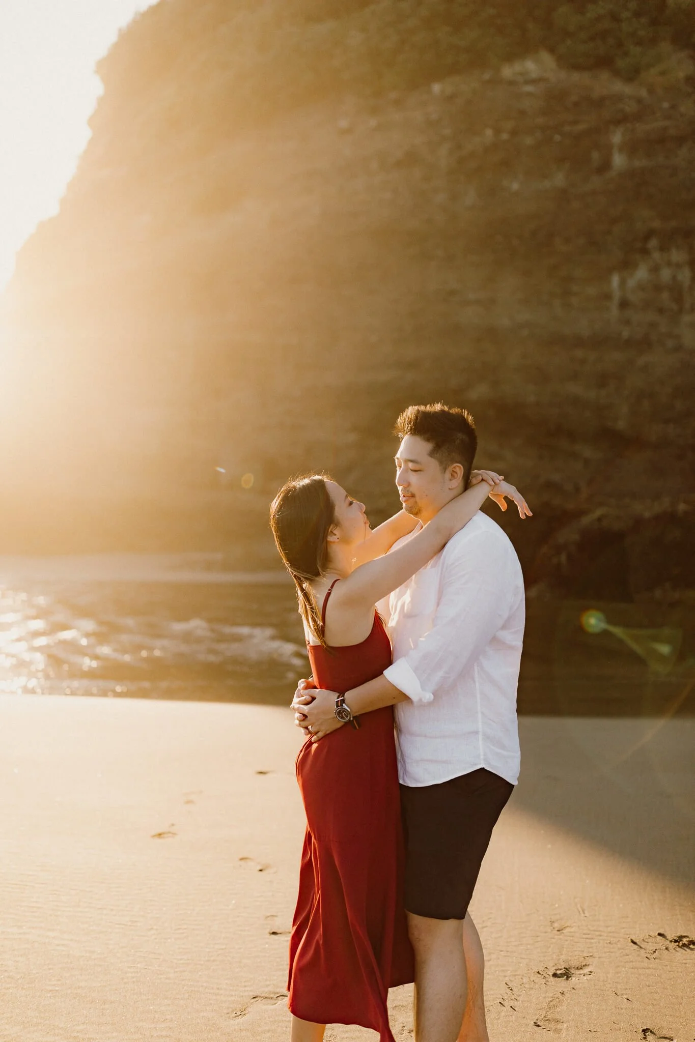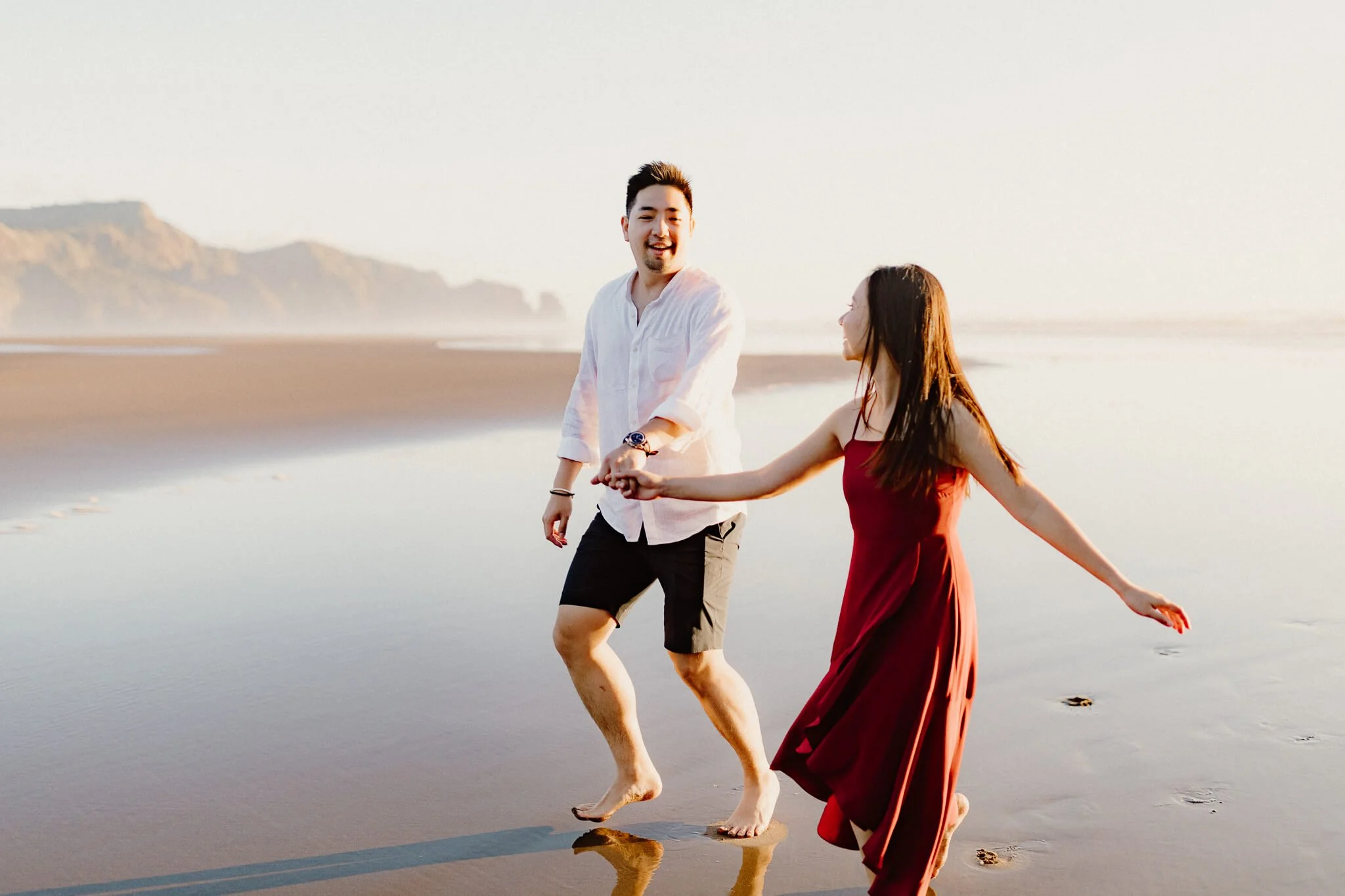 Golden hour photography portraits for Grace and Cedric's post wedding photography session at Te Henga beach, Auckland.