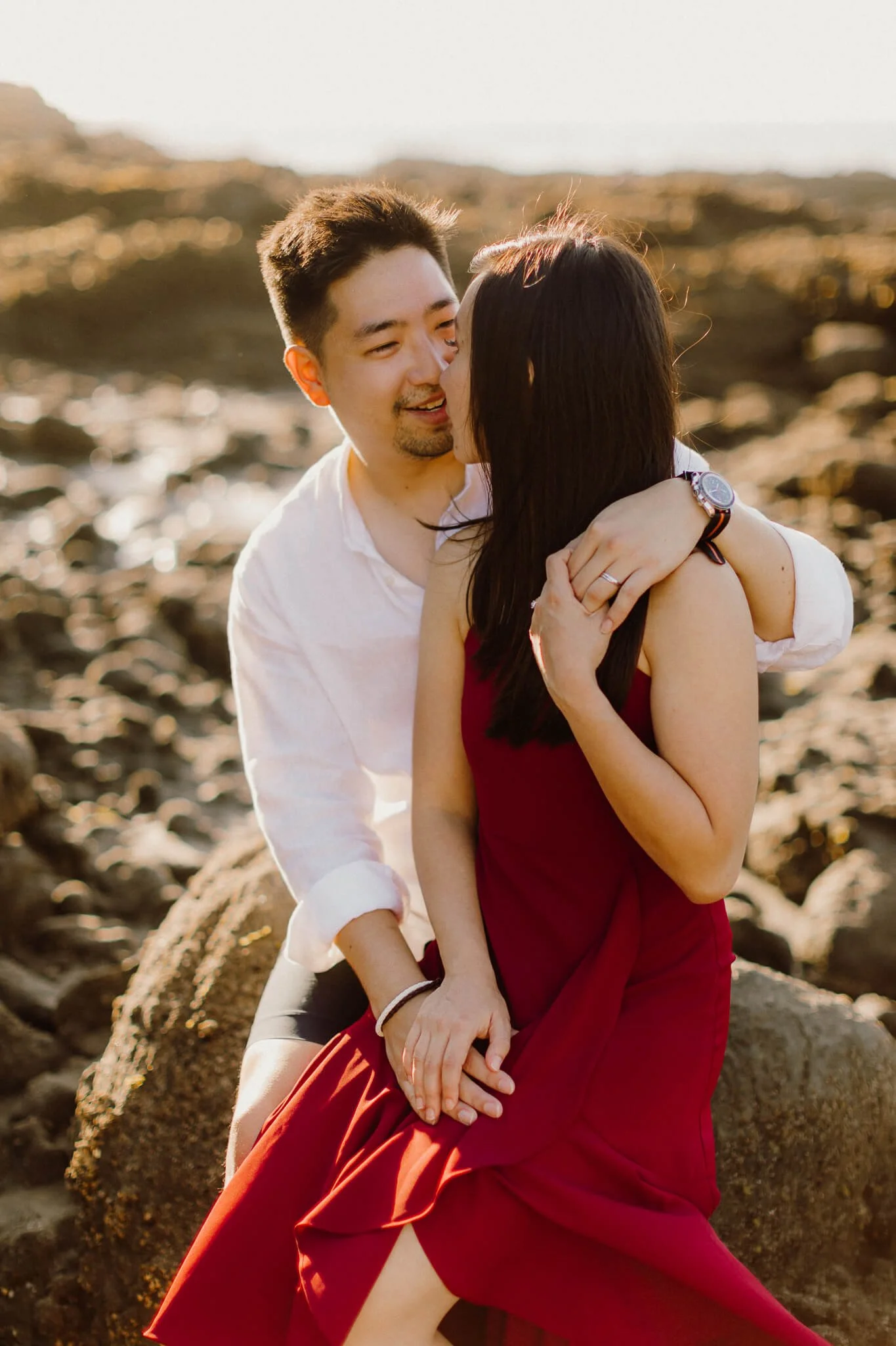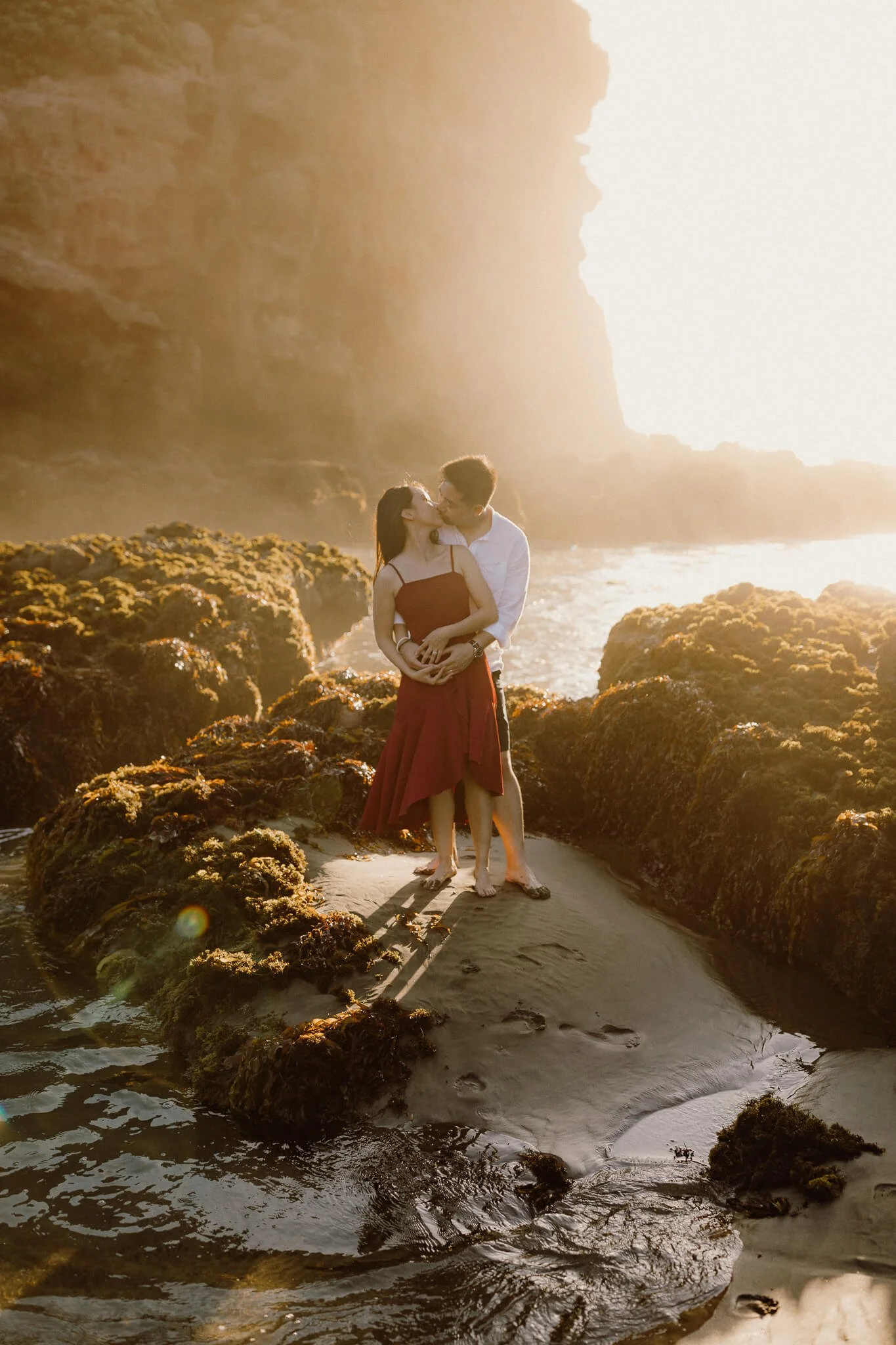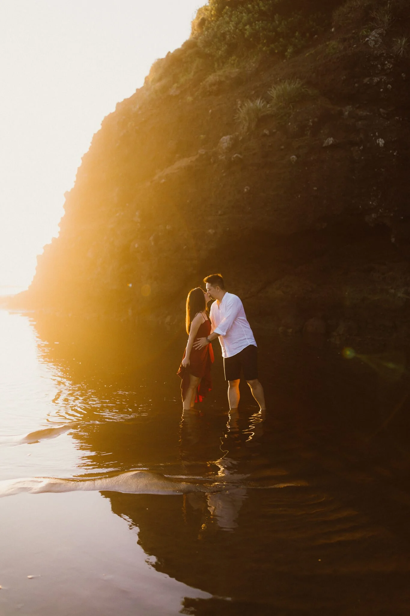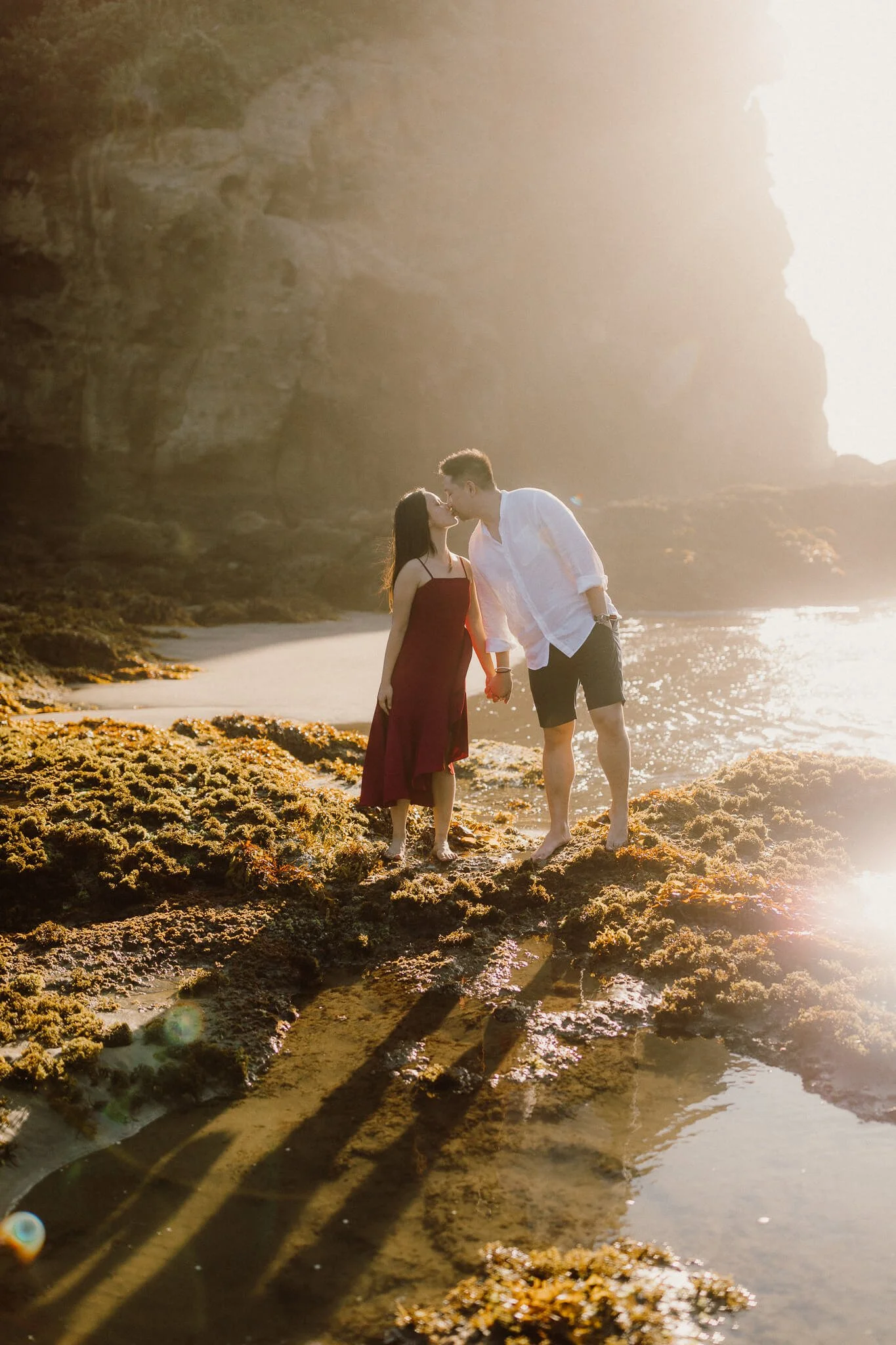 Golden hour photography portraits for Grace and Cedric's post wedding photography session at Te Henga beach, Auckland.
